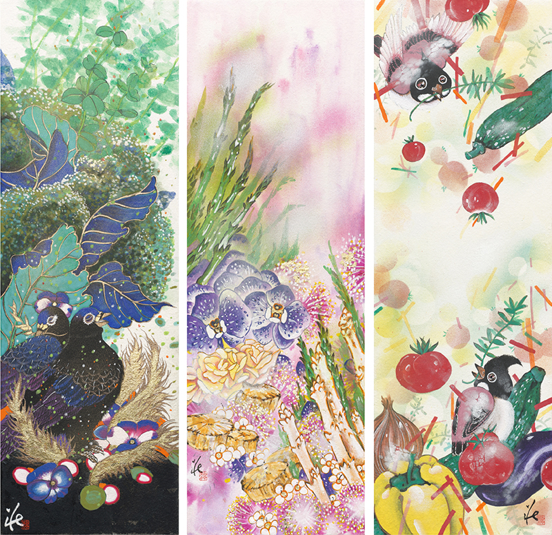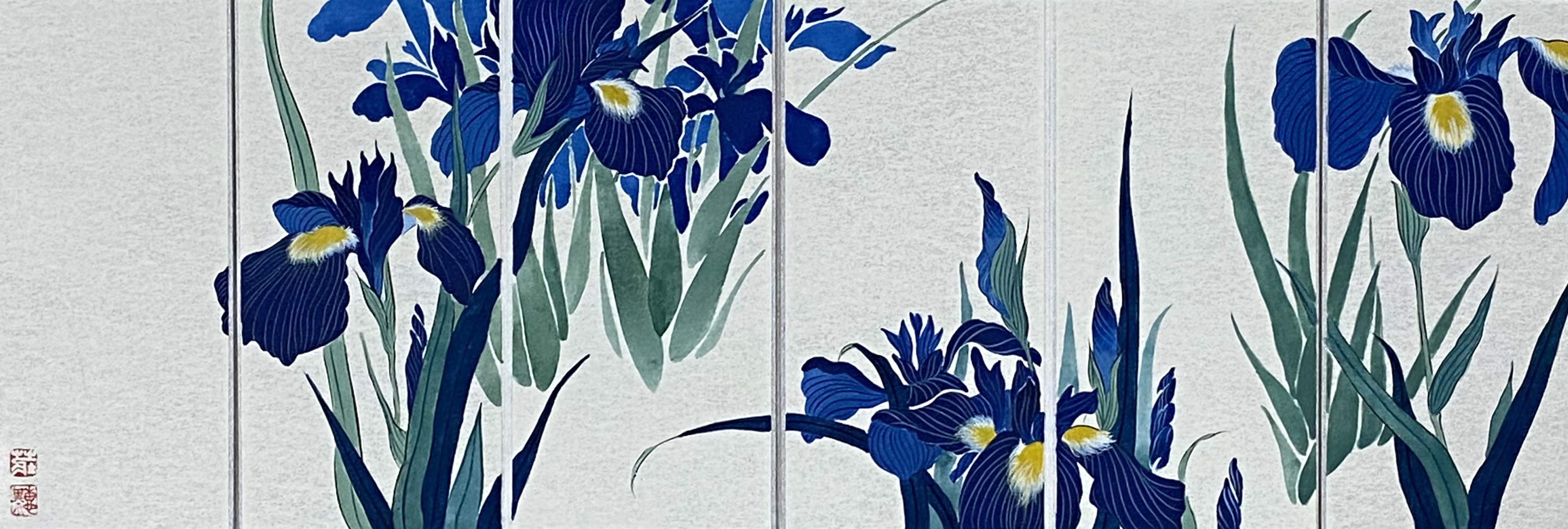 圖一 蜀葵<售出> ・ 圖二 九重葛<售出> ・ 圖三 鳶尾花 ・ 圖四 白藤流水<售出>